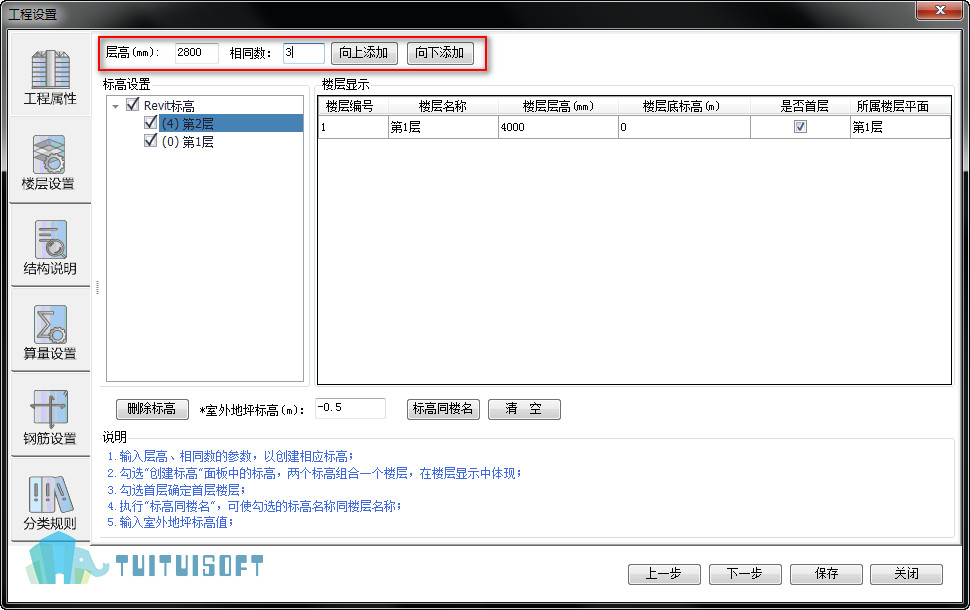 樓層設置是用于建立工程的實際樓層的層數和層高,根據圖紙要求建立標高,通過兩個標高的建立形成一個樓層的概念,按照從下到上的順序依次添加。