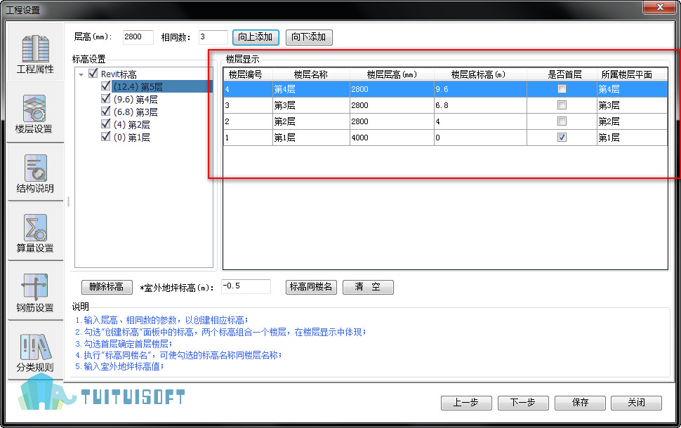 接著在“工程設置”里點擊“樓層設置”在這個界面進行創建標高