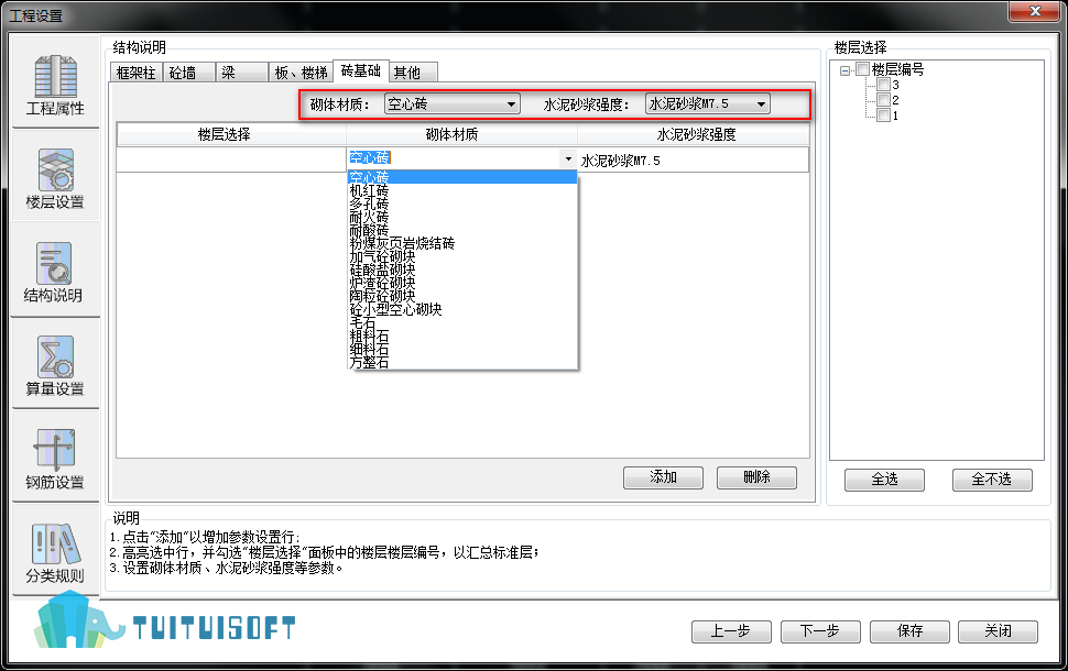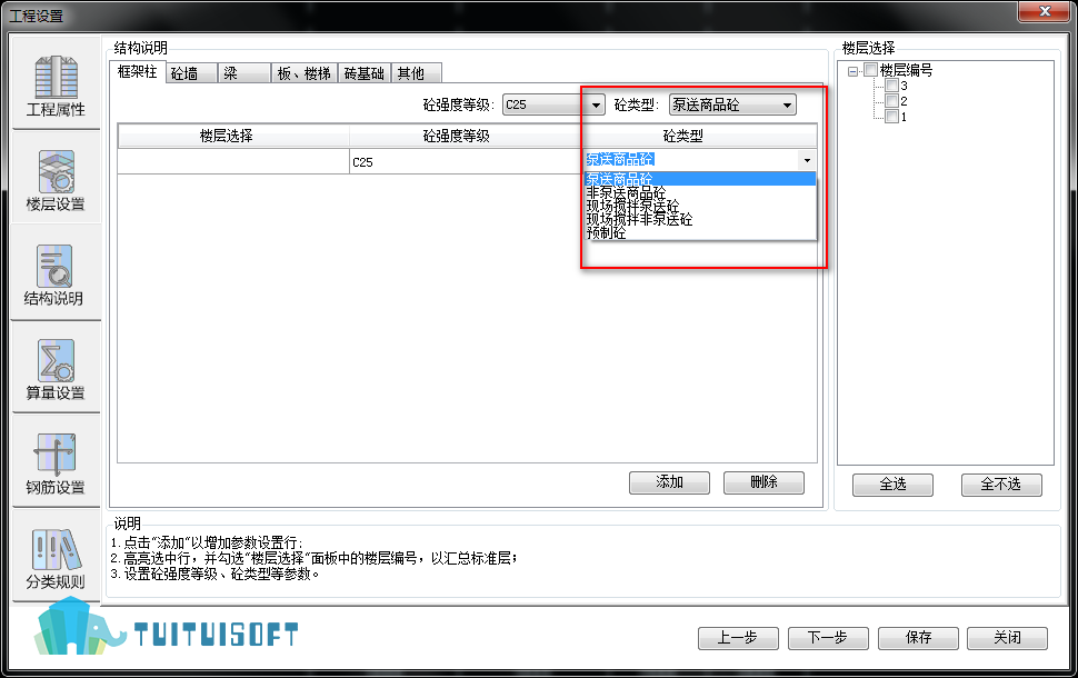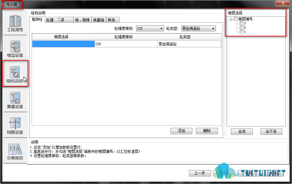 進(jìn)入到“工程設(shè)置”選項(xiàng)卡中的“結(jié)構(gòu)說(shuō)明”界面,右側(cè)有一個(gè)“樓層選擇”欄
