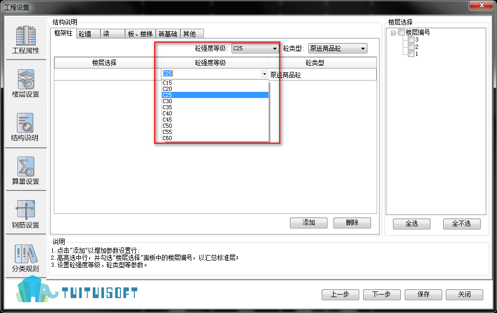 在樓層選擇中,選中需要添加的樓層“勾選”樓層編號(hào)1,砼強(qiáng)度等級(jí)選擇C30。