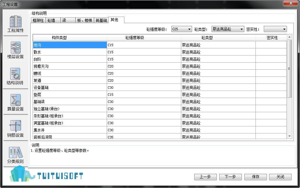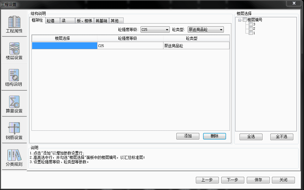 在“晨曦BIM算量”軟件中的“工程設(shè)置”選項(xiàng)卡里有一個(gè)“結(jié)構(gòu)說(shuō)明”的設(shè)置項(xiàng),結(jié)構(gòu)說(shuō)明是根據(jù)工程信息對(duì)框架柱、砼墻以及梁板等構(gòu)件設(shè)置相應(yīng)樓層的砼強(qiáng)度等級(jí)和砼類(lèi)型信息。