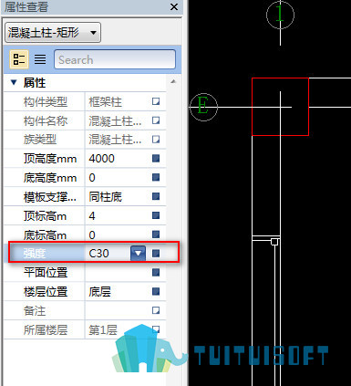 △若項(xiàng)目中同一層的構(gòu)件砼強(qiáng)度等級(jí)有不同的,我們可以用這個(gè)方法,在“屬性查看”里選擇強(qiáng)度下拉列表進(jìn)行修改砼強(qiáng)度等級(jí)。