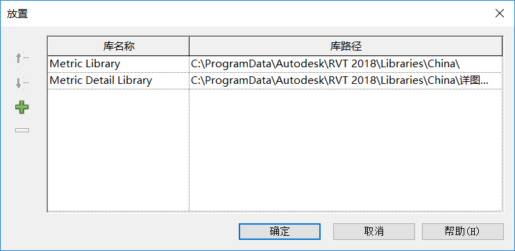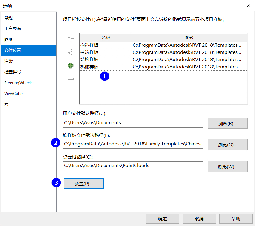 點擊③中“放置(P)...”分別設置族調取的路徑(C:ProgramDataAutodeskRVT 2018LibrariesChina)。
