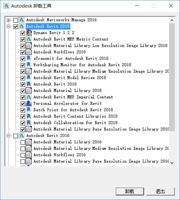單機“Uninstall Tool”打開Revit卸載工具。可以根據需要勾選需要卸載的軟件或組件的復選框,然后點擊“卸載”,這樣就從本地計算機上卸載了對應的軟件。需要提醒學員注意的是,對于Revit或是Autodesk其它的產品都應使用官方自帶的“Uninstall Tool”的卸載工具移除軟件,而不要使用操作系統自帶的“控制面板程序程序和功能”或360等第三方卸載軟件工具進行卸載,否則將導致無法完全卸載Revit等產品,以至于下次無法再安裝上這些軟件。