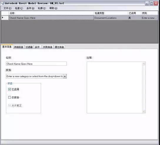 在首次打開 Autodesk Revit Model Review 的“管理”部分時,需要創建并配置檢查。若要開始使用,可以在“文件”下拉菜單下打開擴展名定義為 .bcf 的“檢查文件”。通過“文件”>>“預定義”彈出按鈕可以找到一個預定義的列表。