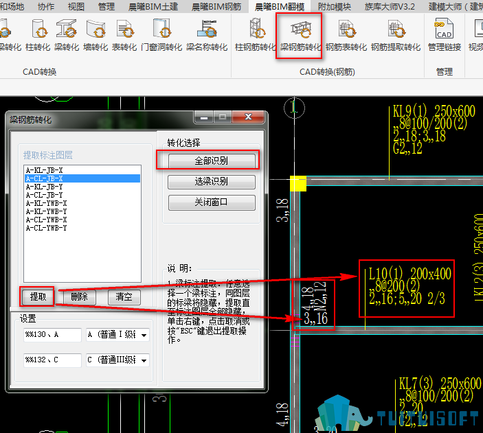 首先點擊梁名稱轉化→提取→圖層標注信息→Esc鍵退出→識別→確認梁名稱轉化是否正確后→轉化。轉化成功后,我們就可以進行下一步了。