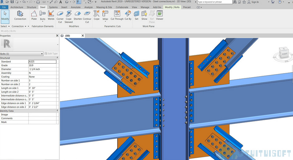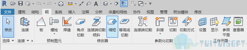 在Revit2019的工具欄中有一個單獨的鋼模塊,在模塊中添加了很多新的功能比如鋼結構連接、預制板與螺栓、角點的切割以及連接端的切割傾斜等等新功能。下面小編以鋼節點連接為例進行講解