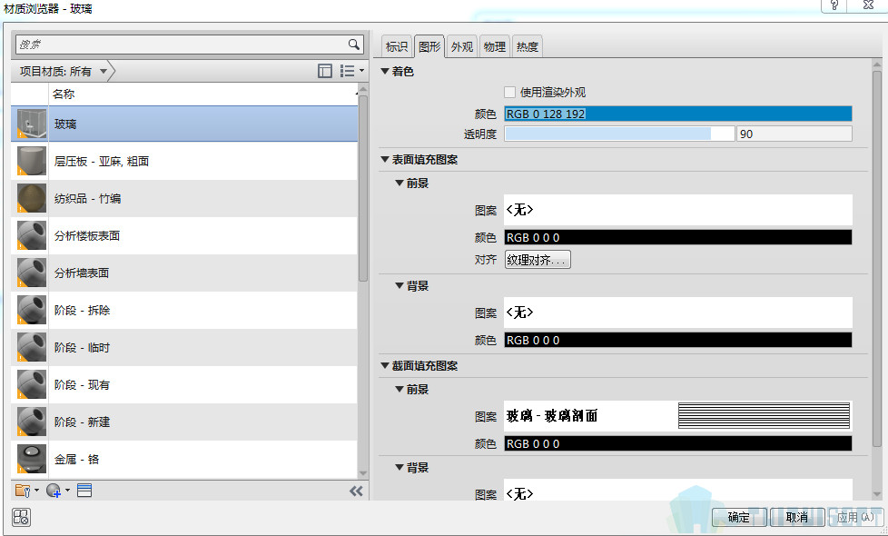 而我們這邊的Revit2018的材質瀏覽面板當中是沒有前景和背景的填充圖案。