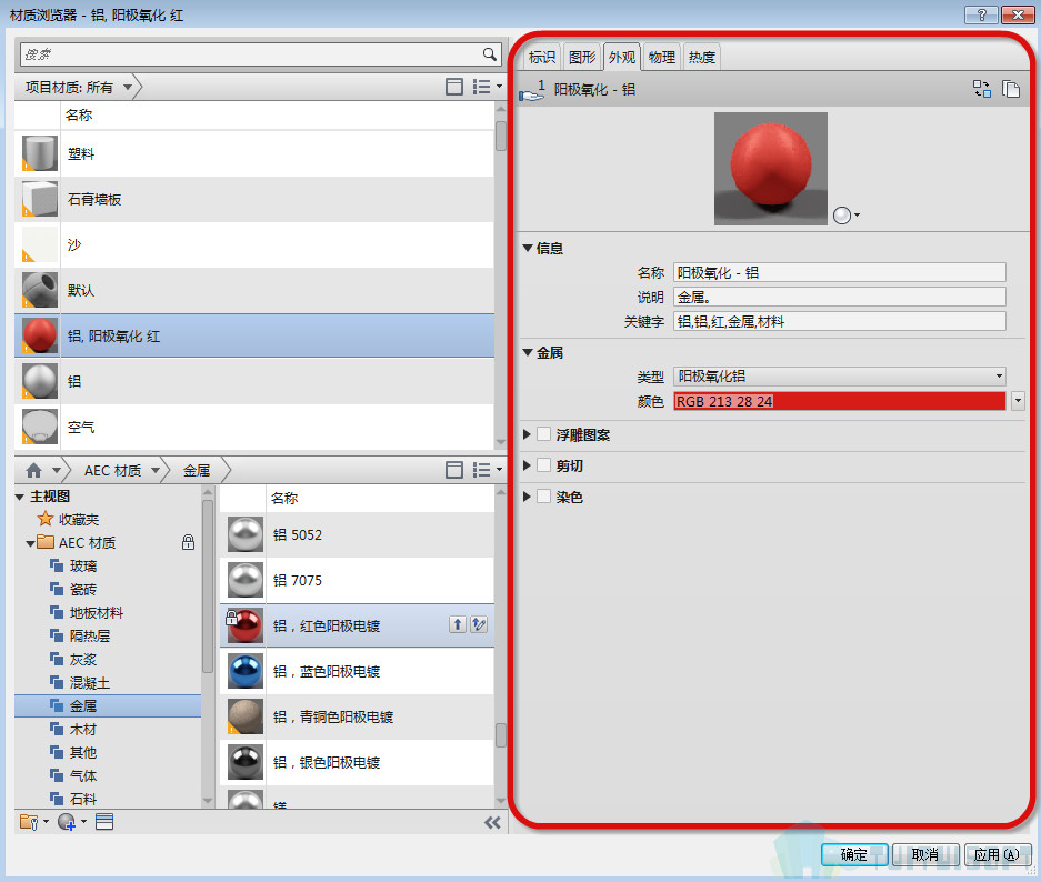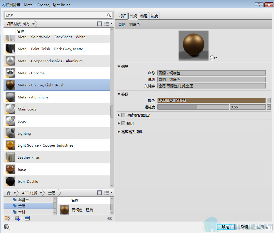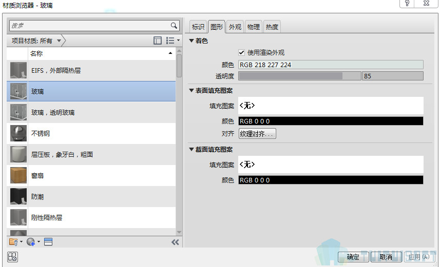 在Revit LT中材質編輯器面板是不會顯示包含在Revit中的物理或熱的選項卡。