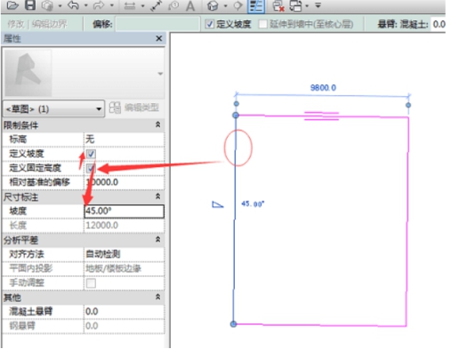 2)勾選定義固定高度,再勾選“定義坡度”,最后在尺寸標注欄的“坡度”中輸入坡度值(可在CAD圖中查找或自己計算)。然后點擊“完成繪制”按鈕即可完成斜板的繪制。