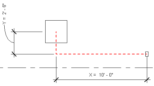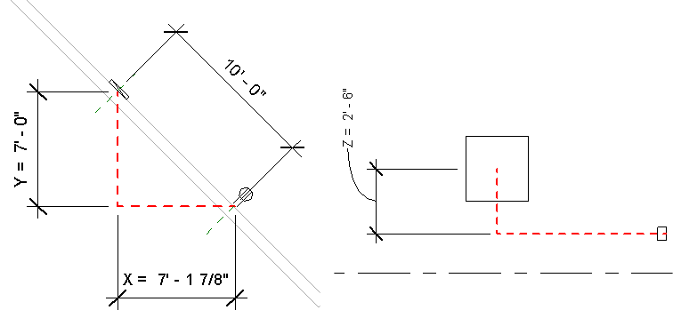 插座與配電盤之間在 X 軸方向的距離為 10',但兩者的高程不同。配電盤的高程為 4' 0",插座的高程為 1' 6",兩者在 Z 軸方向的距離差為 2' 6"。