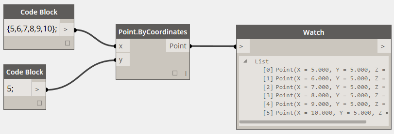 如果我們想創建一列點,它們的Y坐標都是5,而X坐標是從5到10,該怎么做呢(關于Code Block里如何定義數列,請見相關博文):