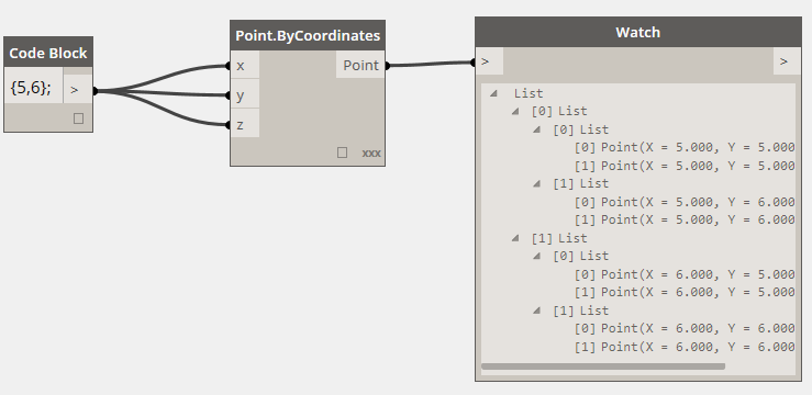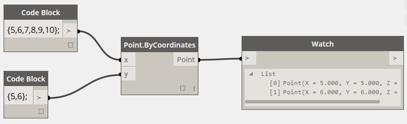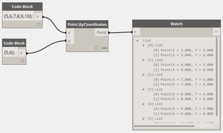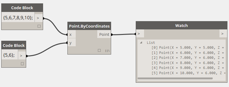 很奇怪吧,多加了一個Y值,竟然生成的點變少了 !原因就是Point.ByCorridnates結點有一個“Lacing”選項。當輸入參數有兩個或兩個以上數組時,“Lacing”選項就會生效。默認的選項是“Shortest”。表示將輸入的數組元素依次序配對,并且只配對到最短的數組元素用完為止。