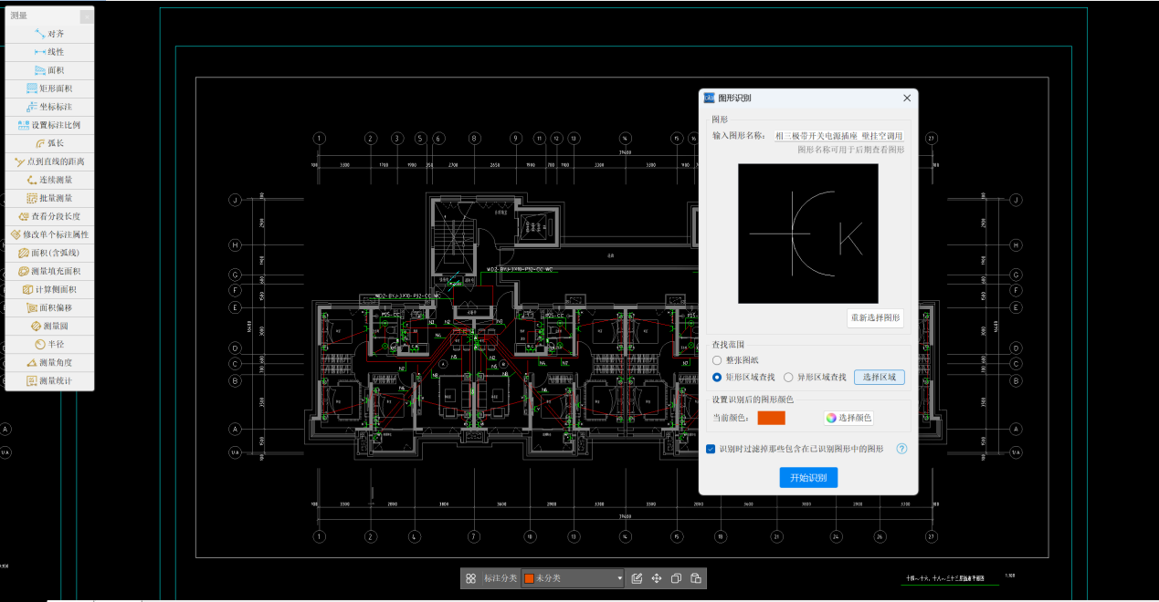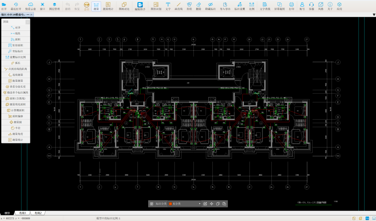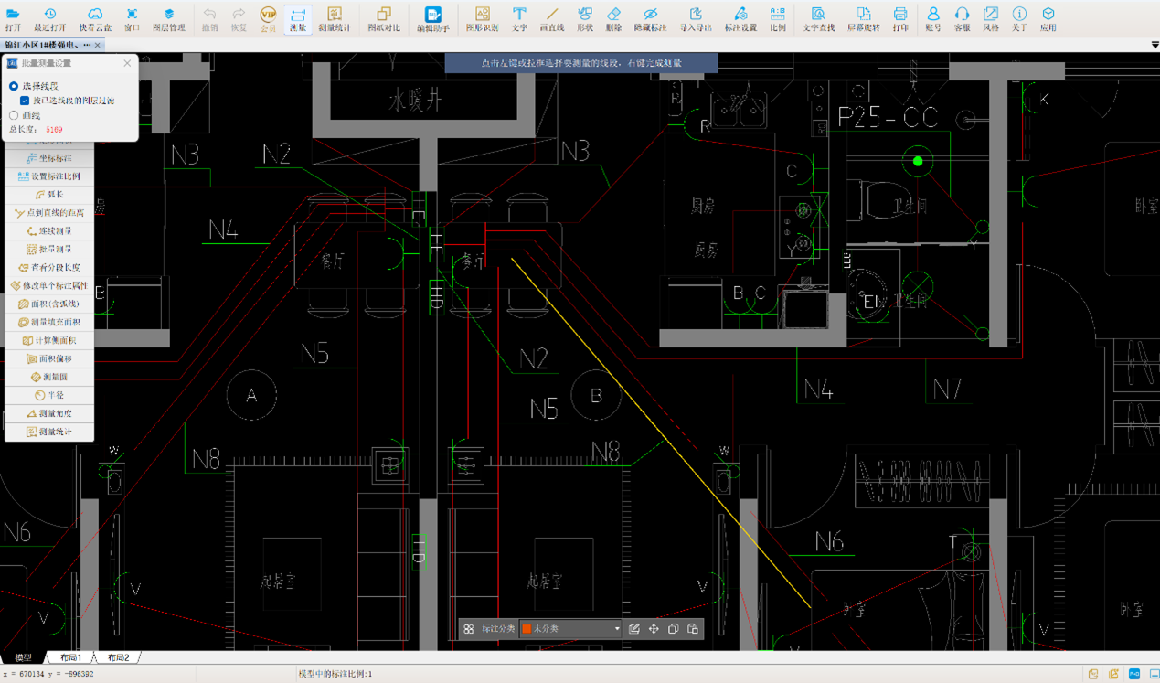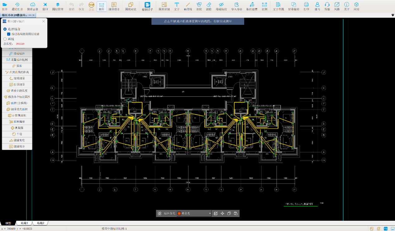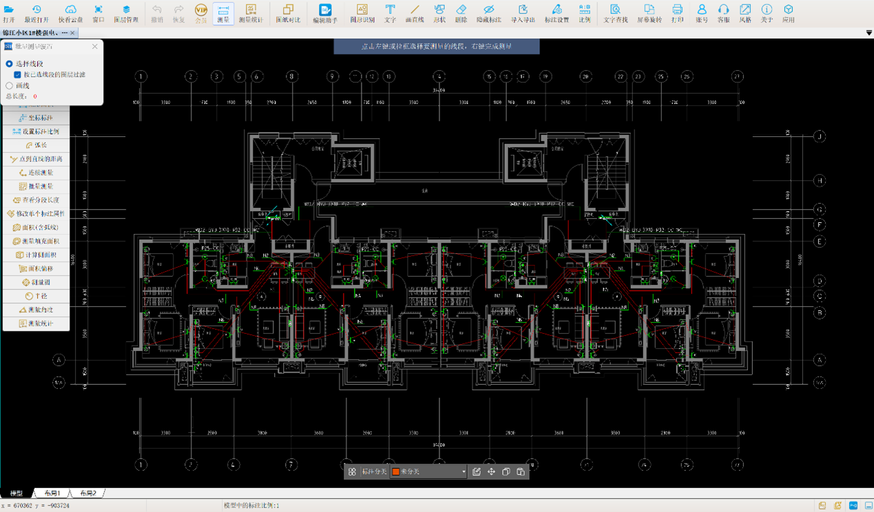 建筑圖內配管配線繁多,手動計量容易出錯。詳細了解電氣插座管線工程量計算要點和工作內容,通過CAD快速看圖結合大樓實例【批量測量】快速計算管線總長。