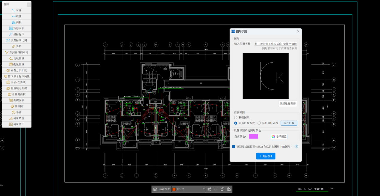 利用【圖形識別】,選中一個插座。為了避免重復識別,應按復雜到簡單的過程進行識別,首先選帶標識的插座,最后選不帶標識的插座。