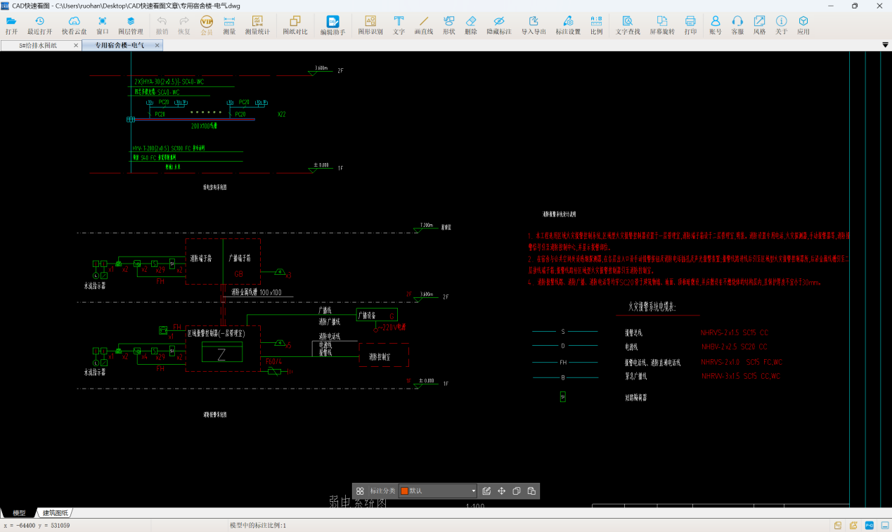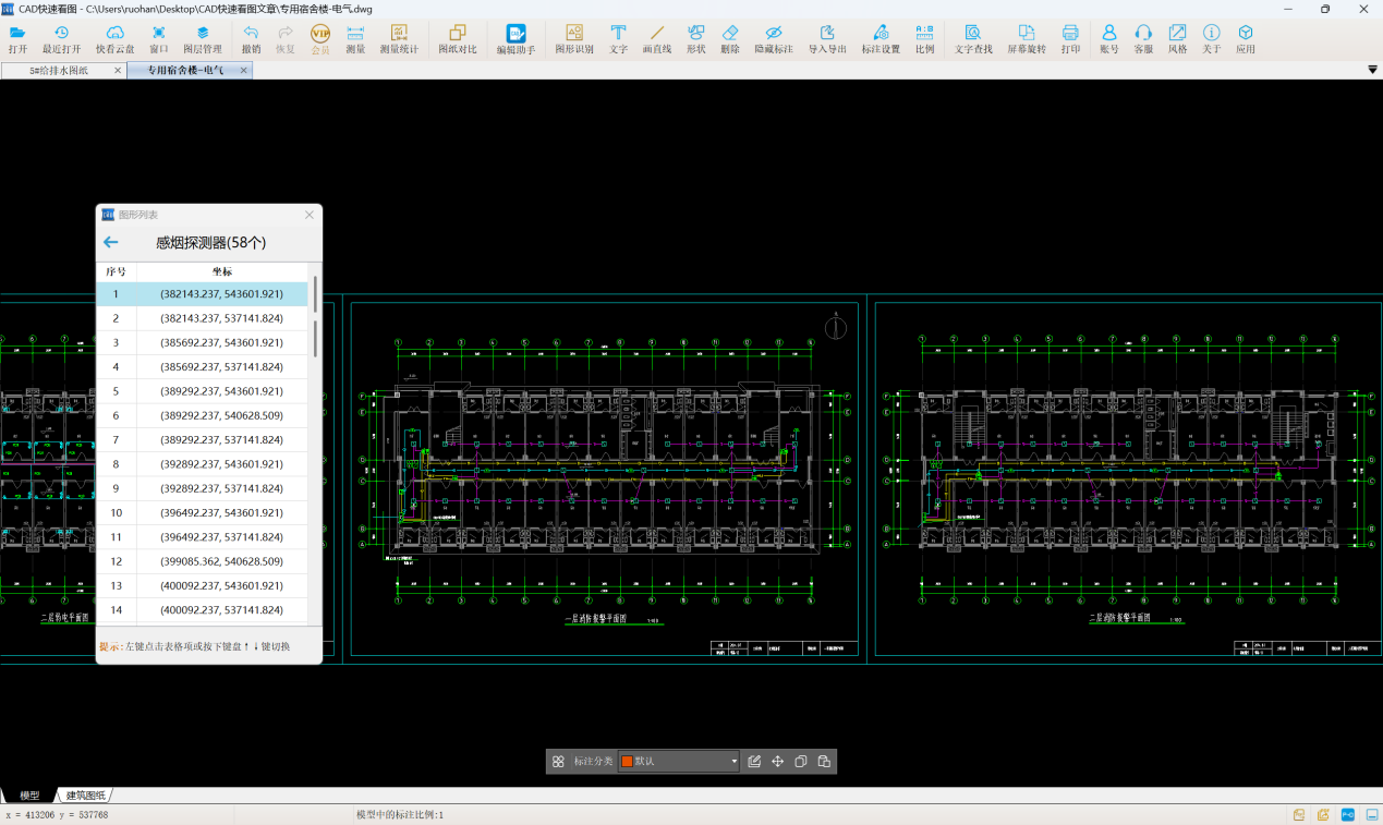 以感煙探測器為例,進(jìn)行識別,框選范圍為一層和二層消防報(bào)警平面圖,得到感煙探測器的數(shù)量為58個。