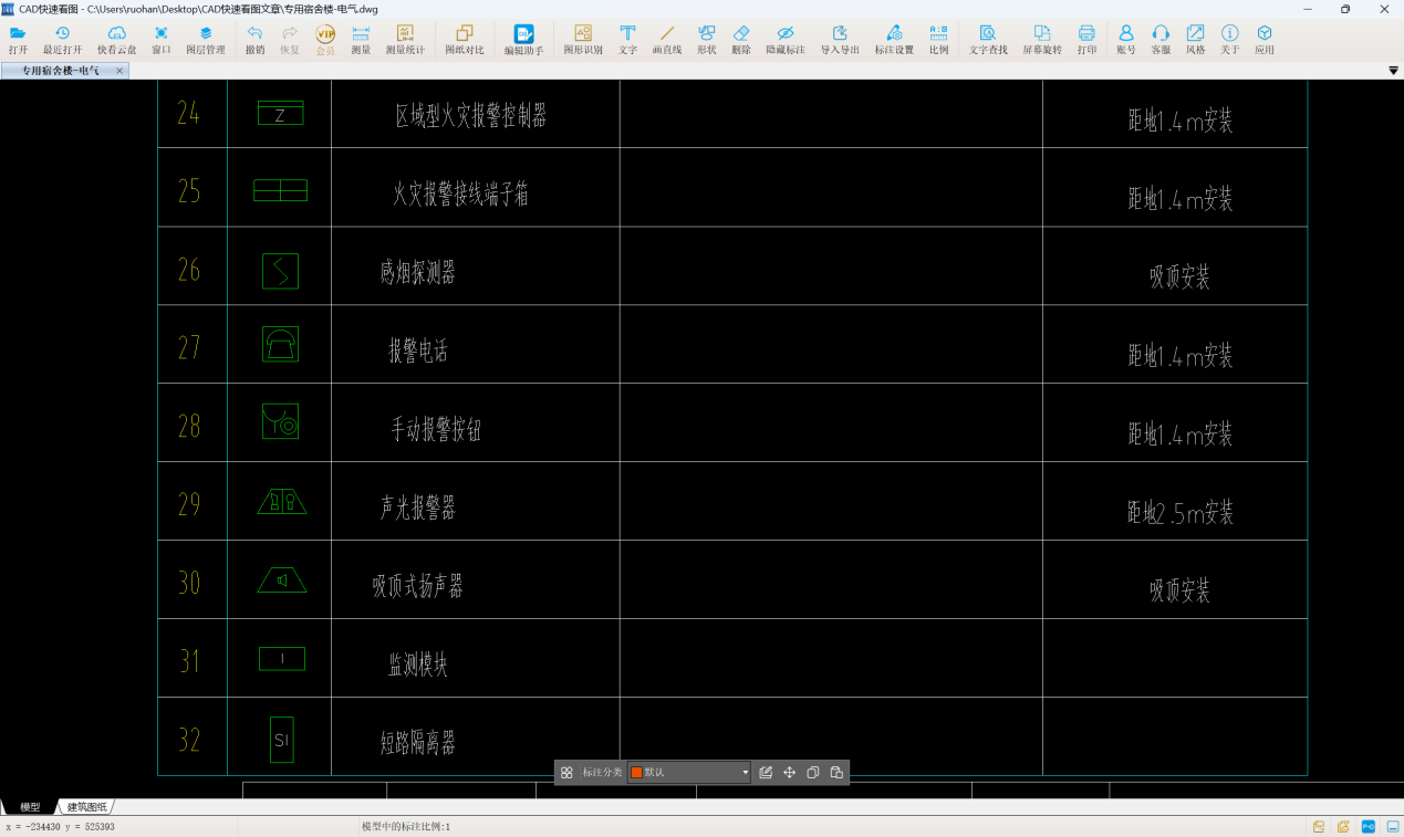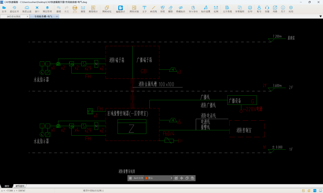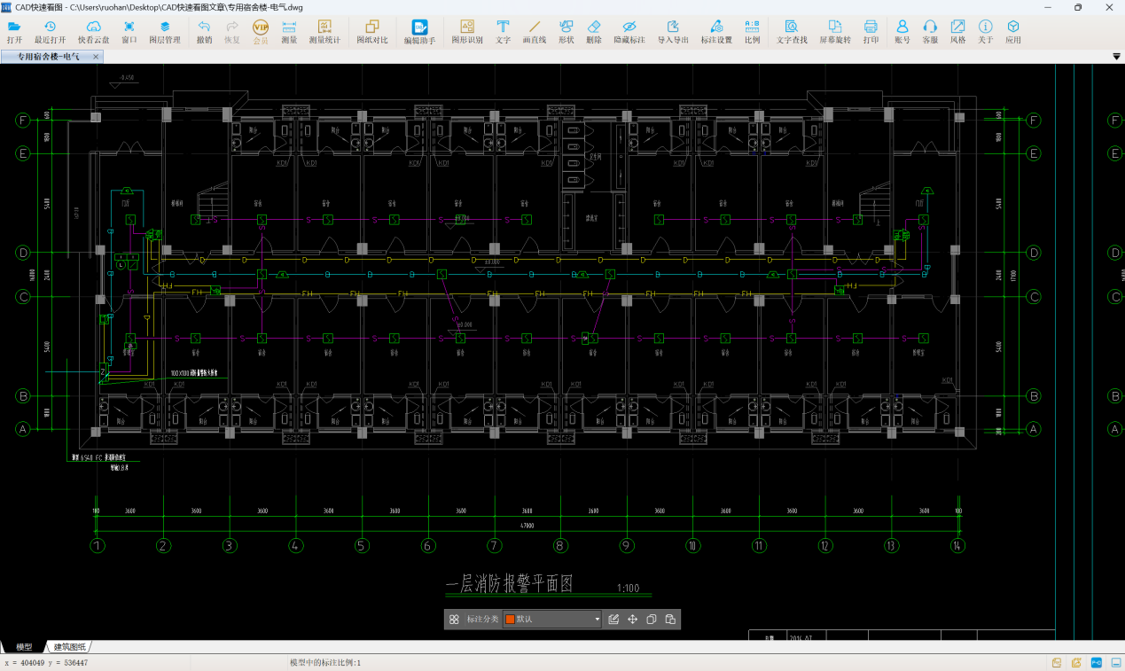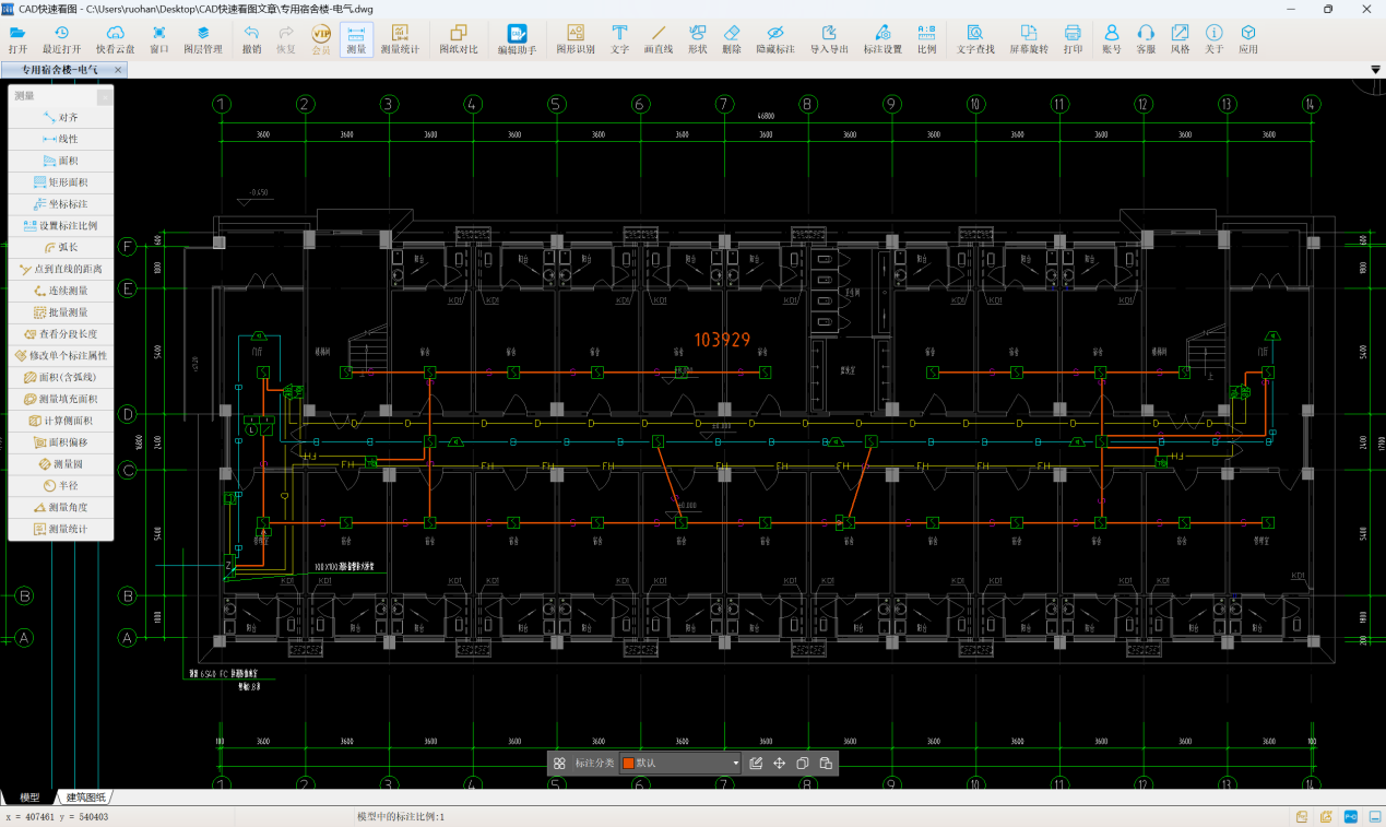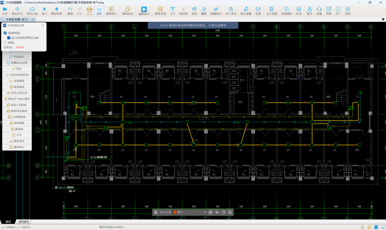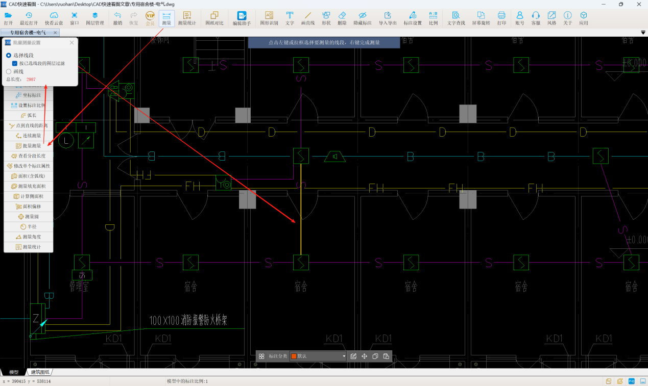 消防電安裝圖紙上會涉及多條管線,一個個量取匯總比較麻煩,CAD快速看圖的【批量測量】功能可以批量量取相同導管長度,直接測量匯總長度,節(jié)省匯總時間。