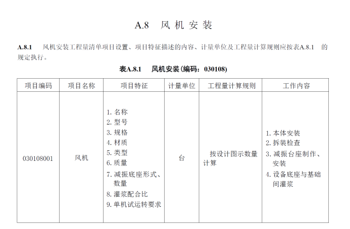風機安裝按設計圖示數量以“臺”計算,此處使用計量標準附錄A 機械設備安裝工程計量規則。