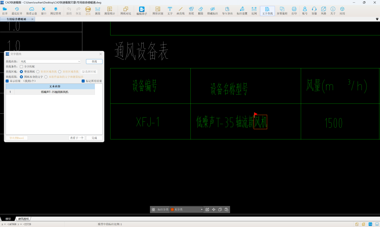 通風機的計量就是如此簡單,CAD快速看圖的文字查找、提取文字功能,簡單方便。