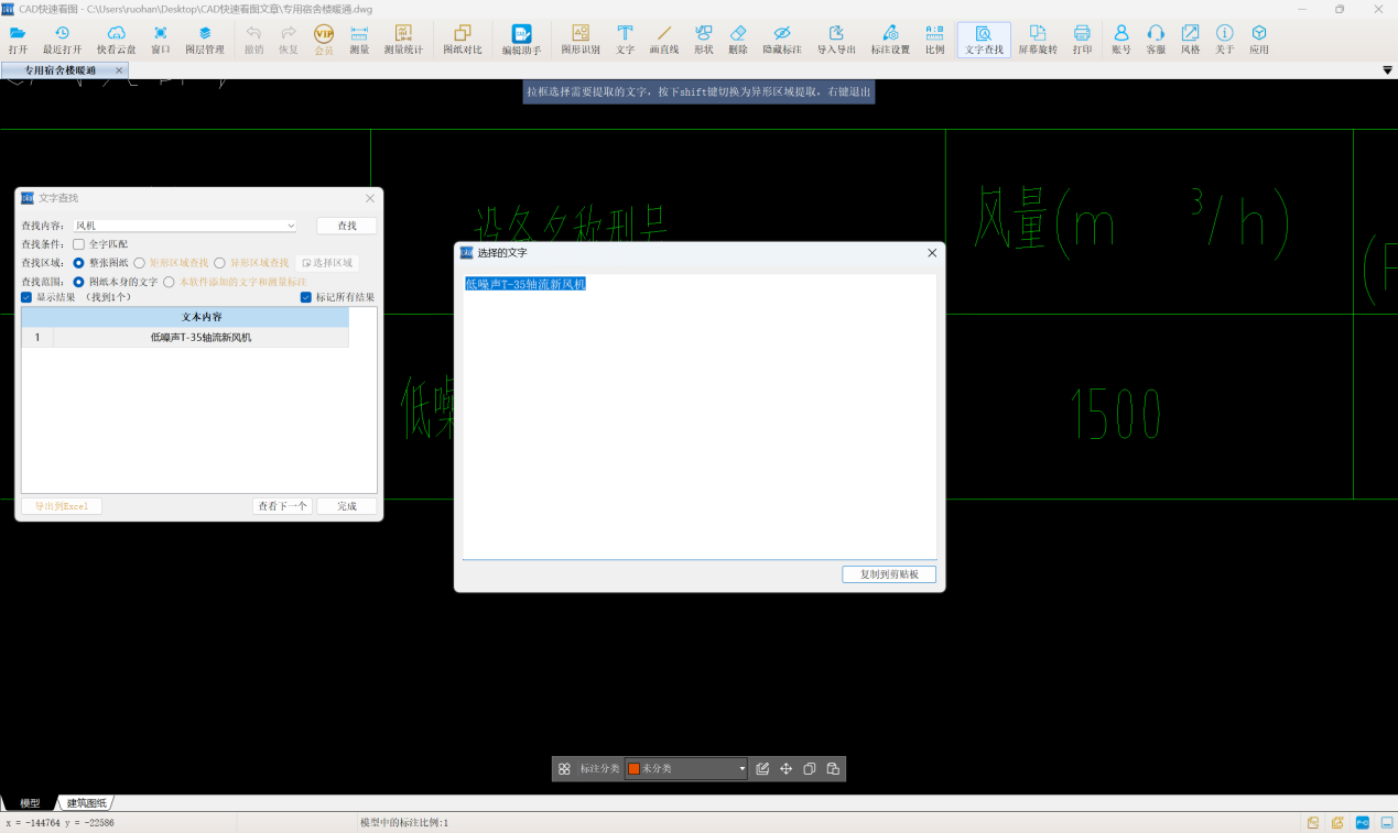 使用【文字查找】功能,輸入“風機”,查找區域選擇整張圖紙,查找范圍為圖紙本身的文字。然后使用【提取文字】功能,框選查找到的帶“風機”的名稱,就自動提取到文字信息了,選中,復制到粘貼板,得到該風機完整的名稱信息:低噪聲T-35軸流新風機。