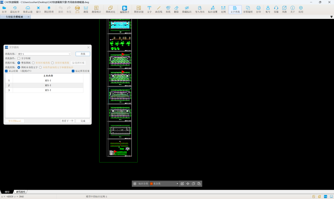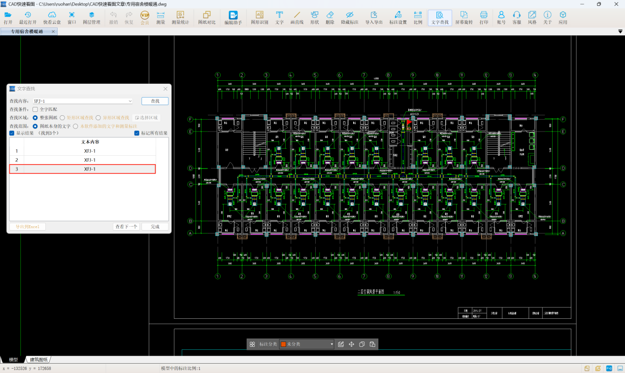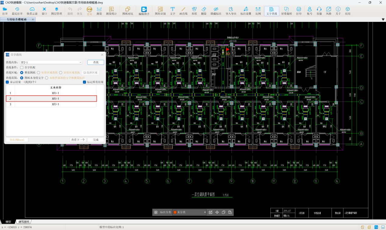 然后繼續使用【文字查找】功能,輸入“XFJ-1”,得到圖紙上有三處“紅旗”標記點。表格中結果顯示同樣為3行,依次點擊表格,除去設備表中名稱,在一層空調風管平面圖和二層空調風管平面圖中各有一臺。