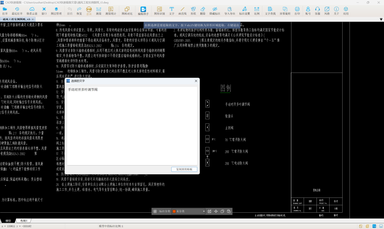 以手動對開多葉調節閥為例進行說明:使用【提取文字】功能,提取到“手動對開多葉調節閥”,點擊復制到剪貼板。接著使用【文字】-【編號文字】功能,粘貼到文本內容中,其后補充“-500*200-”,點擊確定。查找整張平面圖,依次在在相應圖形旁單擊,在圖紙上保留文字,確定數量為3個。