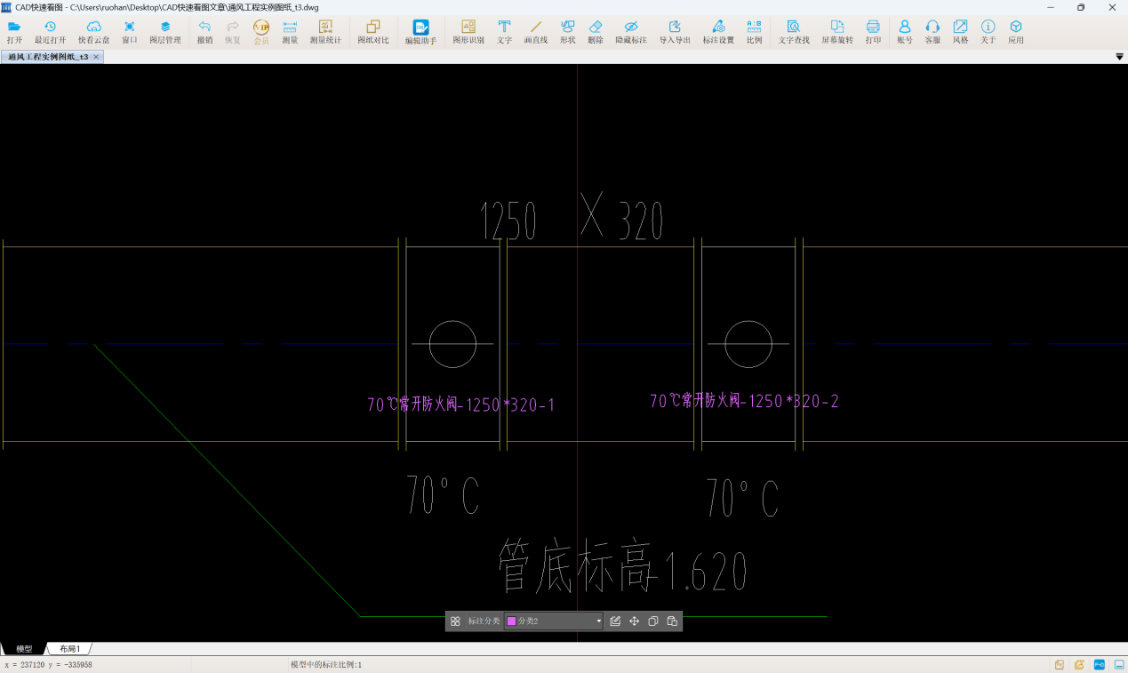 再以70℃防火閥為例,為了便于統計,可以在【標注分類】里新建分類為分類2,設置顏色為粉色。然后采用同樣的方法,查找整張平面圖,得到70℃防火閥-1250*320的數量為2。