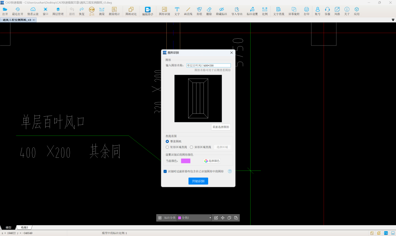 再以單層百葉風(fēng)口400*200為例,為了便于統(tǒng)計,可以在【標(biāo)注分類】里新建分類為分類2,設(shè)置顏色為粉色。使用【圖形識別】功能,框選風(fēng)口圖形,輸入圖形名稱“單層百葉風(fēng)口400*200”,在整張圖紙里進行識別,得到同類型風(fēng)口的數(shù)量為25.