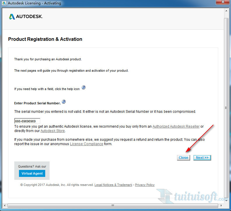 1、安裝完成后打開軟件,將下圖所示的對話框關閉,將會跳出激活頁面,如無法關閉,只需要多關閉幾次即可。