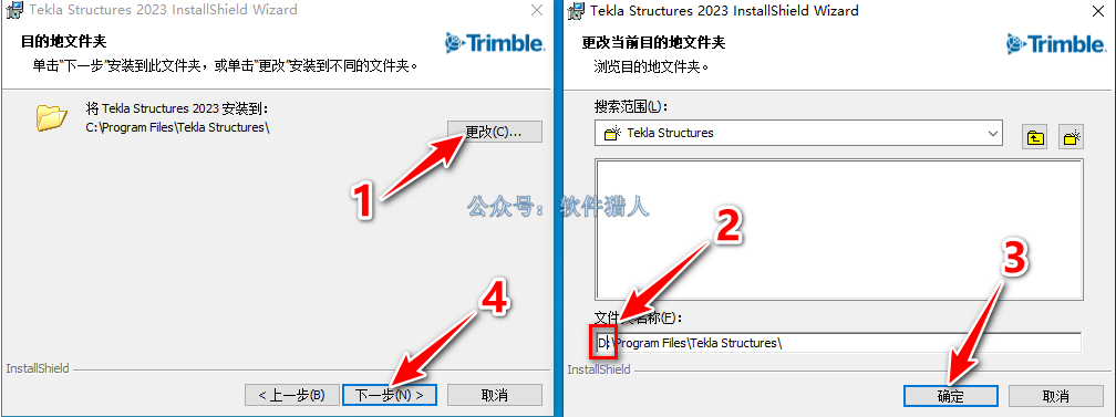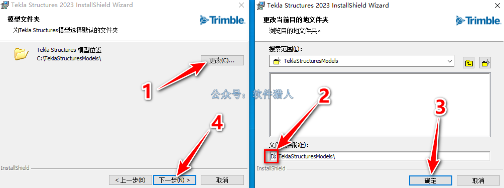 10、①點擊【更改】;②修改模型存儲路徑地址中的C改為D(表示將軟件安裝到D盤);③點擊【確定】;④點擊【下一步】。
