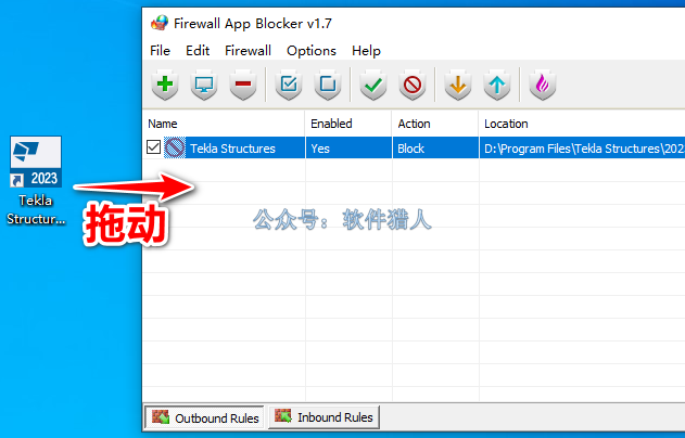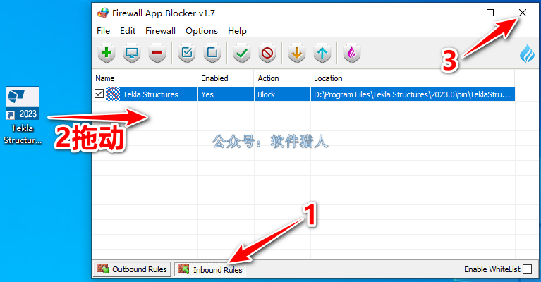 28、點擊【Inbound Rules】,將桌面【Tekla Structures 2023】圖標拖到軟件界面,點擊【X】關閉。