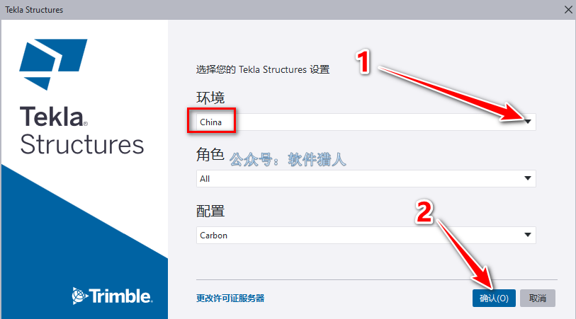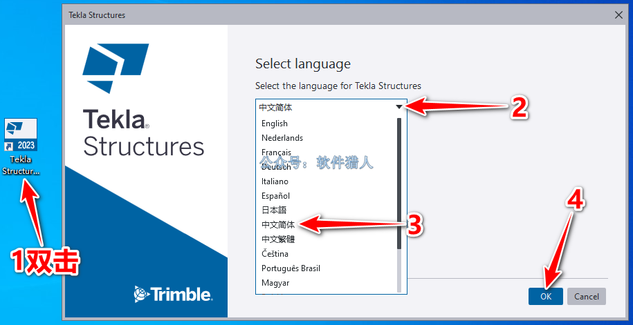 29、雙擊桌面【Tekla Structures 2023】圖標啟動軟件,將語言改為中文簡體后點擊【OK】。