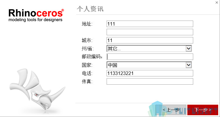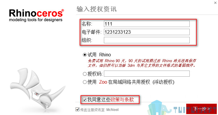 4、接著點解安裝之后會出現一下的對話框,輸入一些對應的信息之后選擇“試用Rhino”并點擊“我同意這些政策與條款”