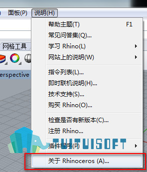 12、雙擊Keygen這個程序之后彈出一個激活碼的對話框,接著回到軟件當中,在軟件的工具欄中雙擊“說明”這個工具,在說明的下拉列表當中選擇關于Rhinoceros 5(A)這個選項