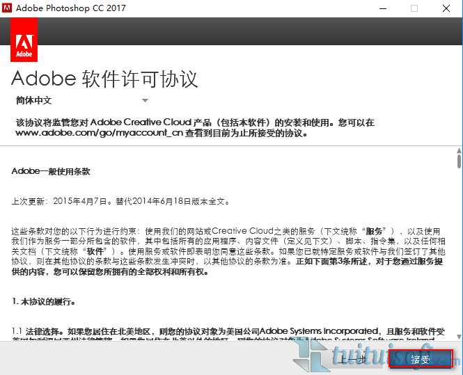 7.登陸完成之后,出現了“Adobe的軟件許可協議”這個對話框,在這個對話框當中選擇“接受”
