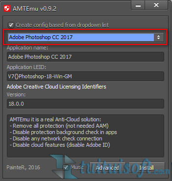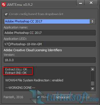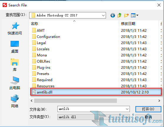 11.選中之后點擊注冊機右下角的“Install”,接著出現一個文件管理器的對話框讓你找到一個“amtlib.dll”的文件,若是找不到這個文件可以再默認路徑中打開,默認路徑為“C:Program FilesAdobeAdobe Photoshop CC 2017”,接著找到amtlib.dll”這個文件并雙擊打開,接著就可以在注冊機里看到“ok”的字樣