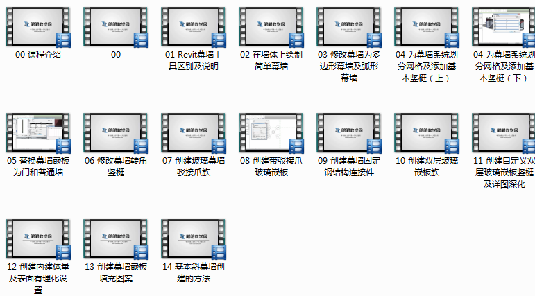 3、知識點:涵蓋墻體所有知識點,包括高級編輯基礎繪制、幕墻、幕墻網格、幕墻豎梃、異性幕墻、體量幕墻運用